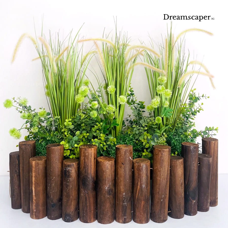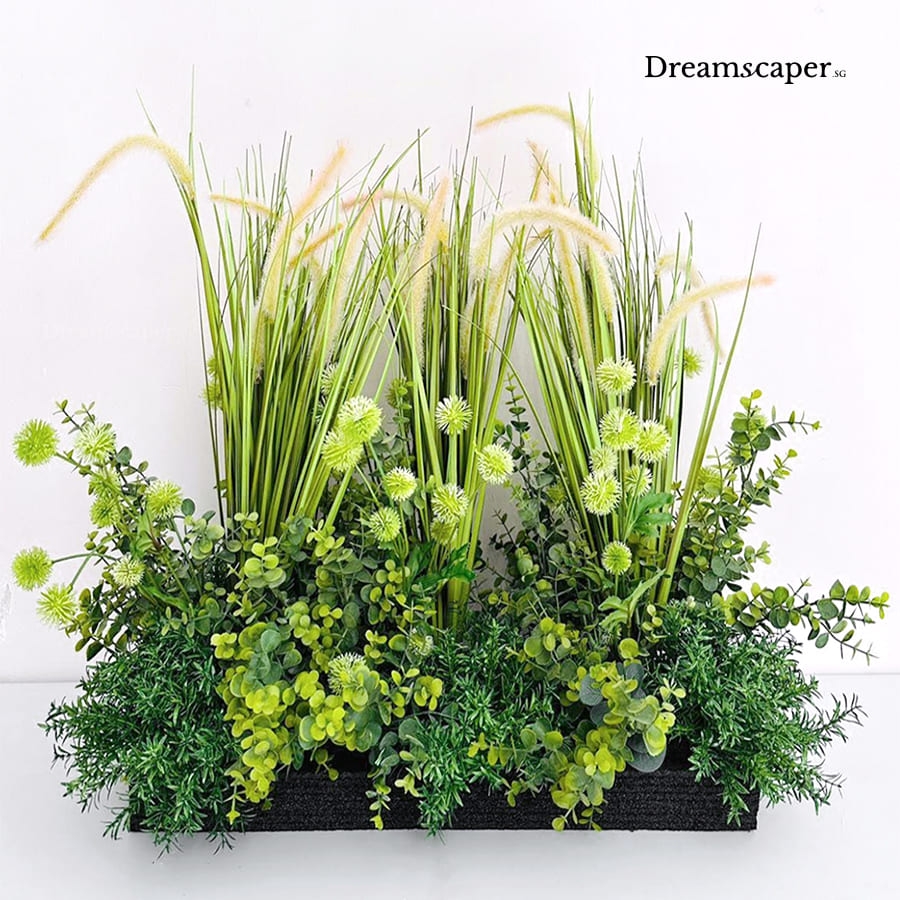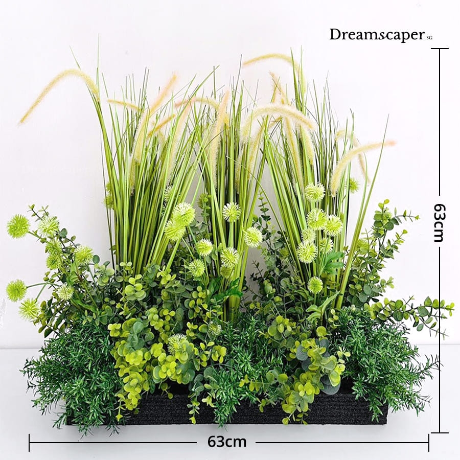 Realistic faux green plants add life and vibrance to any occasion and this artificial green planter arrangement is great for large events, product showcase and corporate meetings. Add on some artificial orchid stalks or long stem peony flowers for a lively and impressive showcase!