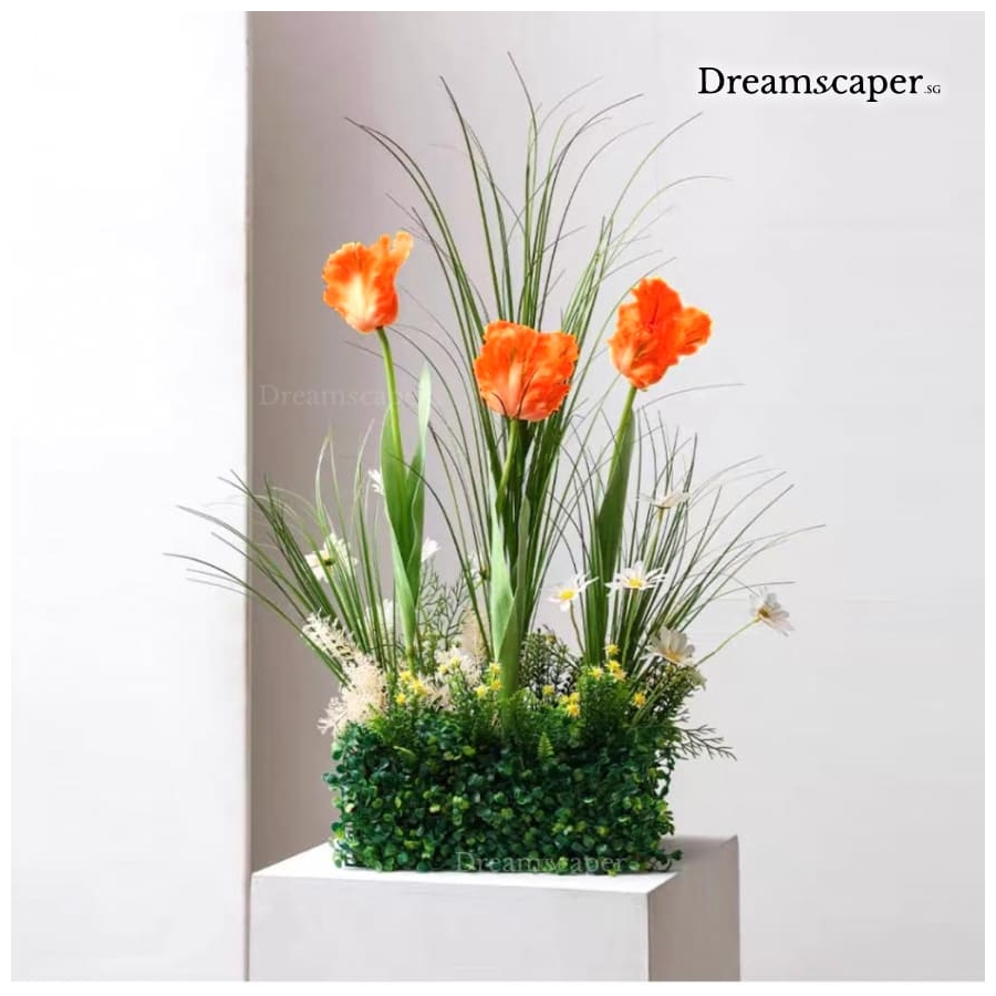 A vibrant artificial flower arrangement featuring orange tulips, daisies, and lush green foliage. This cheerful piece adds a fresh, natural touch to your decor setup — perfect for stage, photo backdrop, or table styling. Ready to use and easy to pair with rustic or garden-themed decorations.