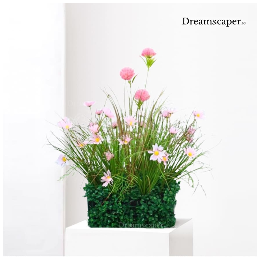 A vibrant artificial flower arrangement featuring pink daisies and lush green foliage. This cheerful piece adds a fresh, natural touch to your decor setup — perfect for stage, photo backdrop, or table styling. Ready to use and easy to pair with rustic or garden-themed decorations.