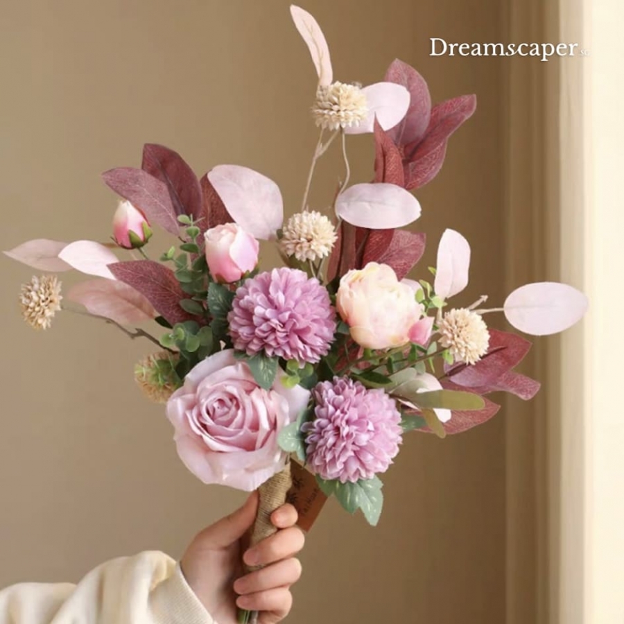 This elegant and realistic purple artificial floral bouquet is perfect as a bridal bouquet or as a small floral table arrangement. It is also good as floral decor for garden themed weddings. Dimension: 30cm (H) x 20cm (W) This elegant and realistic purple...