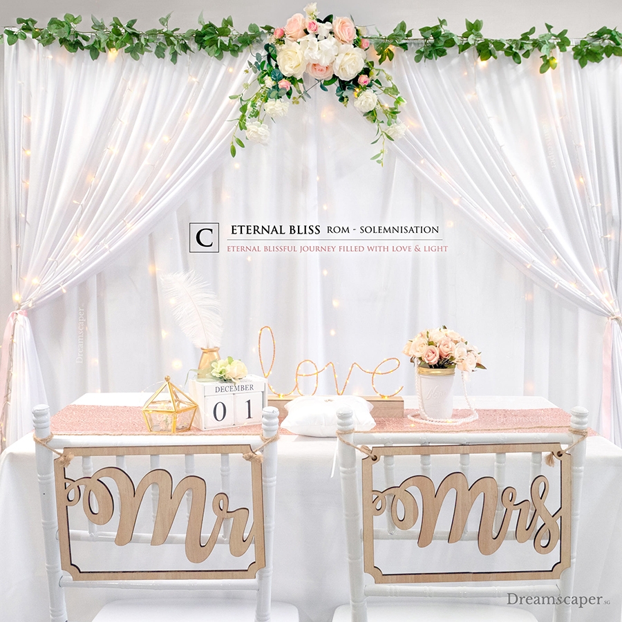 Eternal Bliss ROM & solemnisation table decor setup is inspired by magical fairytale weddings. At just $88 (self-collect & return), this is ideal for couples who wants a beautifully decorated set without breaking the bank. Add-ons fairy light curtain backdrop for a dreamy display!