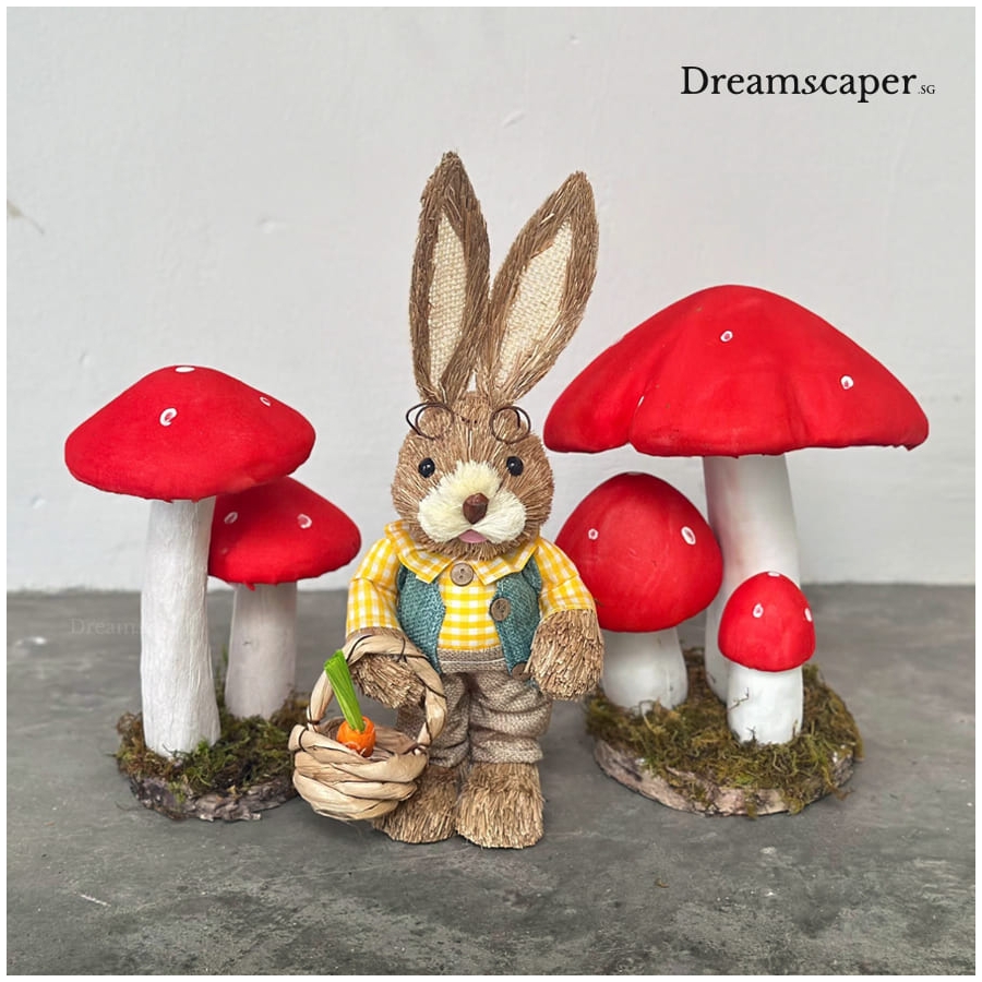 Adorable rabbit holding a carrot basket, surrounded by red mushrooms on a mossy base adding a pop of color and a fairy-tale charm for your decor. Perfect for Easter, garden theme display!