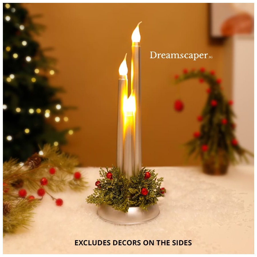Illuminate your celebrations with this elegant Festive Silver Candles cluster. The set of three joined metallic silver LED tapers, creating an instant centerpiece. Perfect for Christmas table centerpiece and festive celebrations.