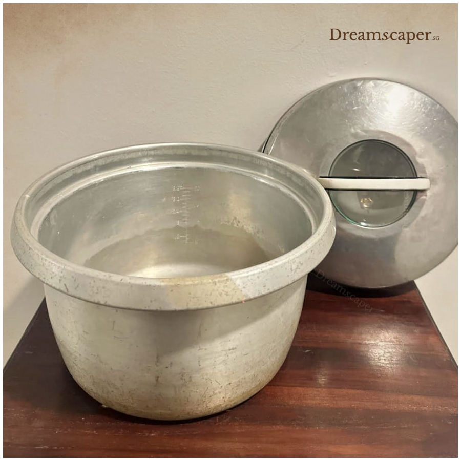 Singapore Heritage Decor Setup - A nostalgic kitchen staple from the 60s–90s, this vintage-style rice cooker pot adds an authentic local touch to heritage displays or retro food setups. Great for old-school event decor, heritage photo shoots, or nostalgic decor display.