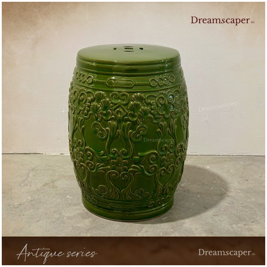 This exquisitely crafted Oriental garden seat embodies elegance and tradition. Featuring intricate patterns and a vibrant green shade, it is adorned with classic motifs such as floral designs. Perfect for adding a touch of sophistication to any classic oriental-style events!
