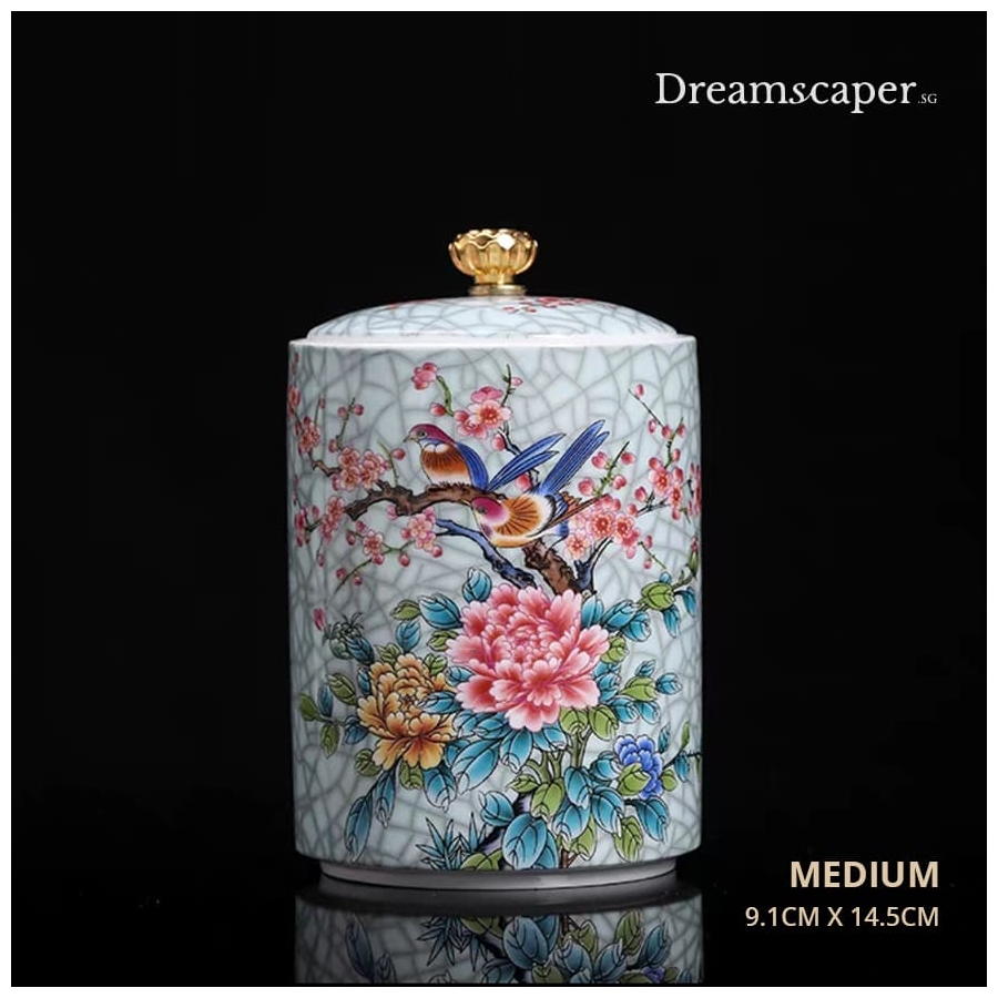 Add timeless elegance to your space with this peranakan porcelain jar, featuring hand-painted motifs of birds on blooming plum branches and vibrant peonies. Perfect as a standalone accent or as part of a heritage decor, this medium-sized jar brings color and cultural charm to oriental-themed styling and wedding tea ceremonies.