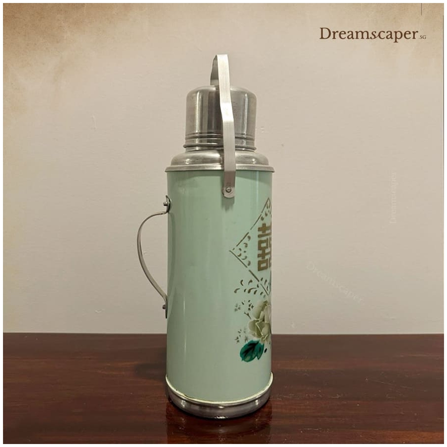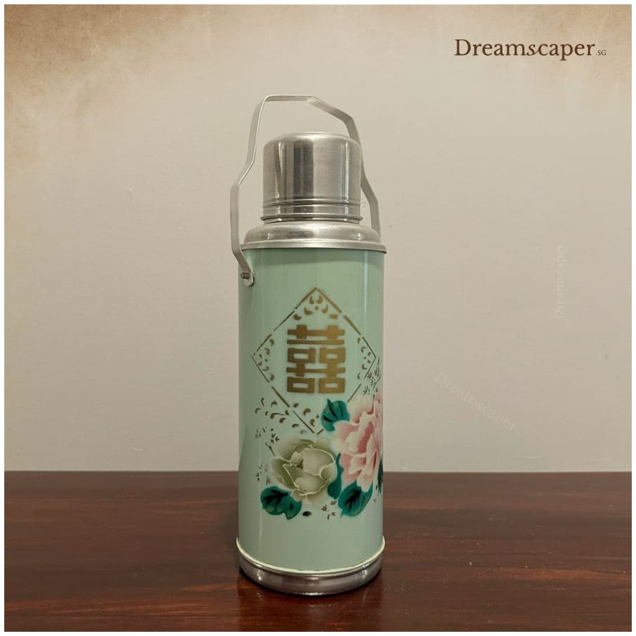 This chinese wedding flask commonly used in Chinese weddings. It features a soft pastel green base with a floral design, prominently displaying the iconic gold Double Happiness (双喜) symbol, which represents good fortune and marital bliss.
