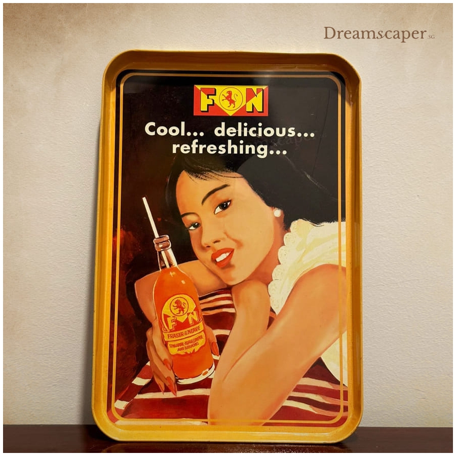 This nostalgic F&N metal tray features a charming vintage advertisement, evoking the golden era of classic soft drinks. With its retro slogan, perfect for enhancing the ambiance of places with a heritage, Peranakan, or old-school kopitiam vibe!