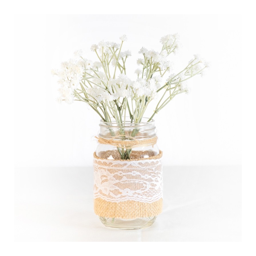 Mason jars are very popular for weddings and parties but these burlap & lace-covered mason jar stands out from all mason jars universe! Great as centerpieces with chalkboard table sign and baby's breath!