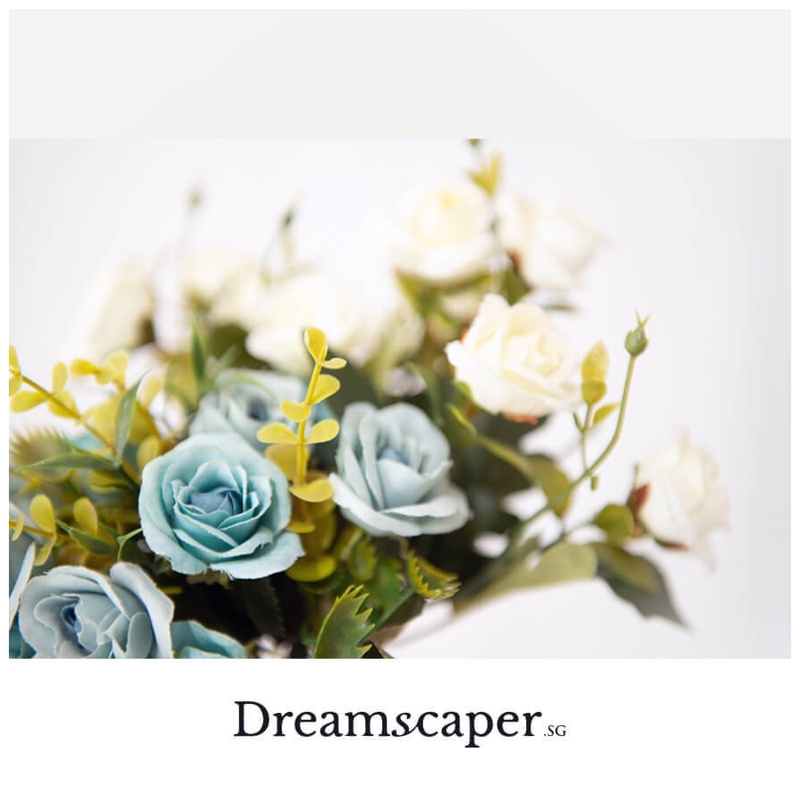 Beautiful in light blue! Miniature roses are true roses, bred to stay small in size. Our realistic artificial light blue rose bouquet looks lovely no matter where you style it - on vase or mason jar etc.