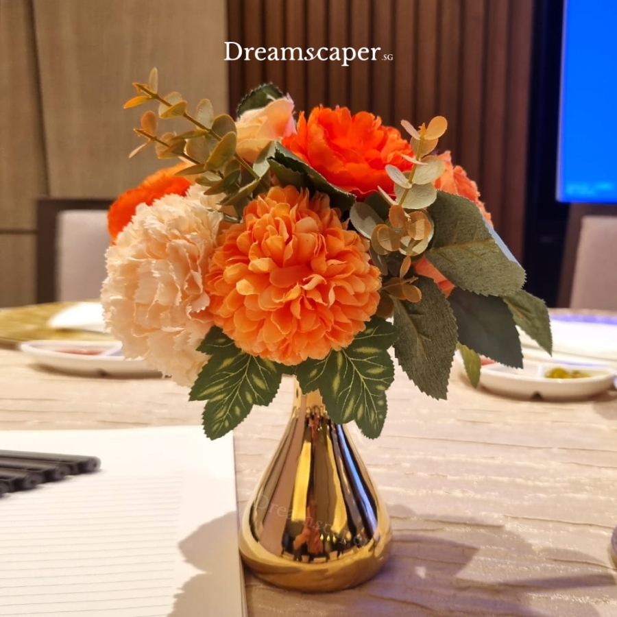 Elevate your decor with our mini artificial orange flower centerpiece! Perfect for adding a touch of elegance and vibrance to any space, its petite size makes it ideal for corporate dinner banquet and ROM wedding table.