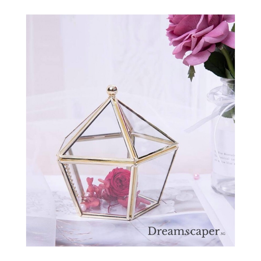 Our elegant and classy small gold hexagon glass box can be used as a vase or as a ring box for ROM solemnisation. Our elegant and classy small gold...