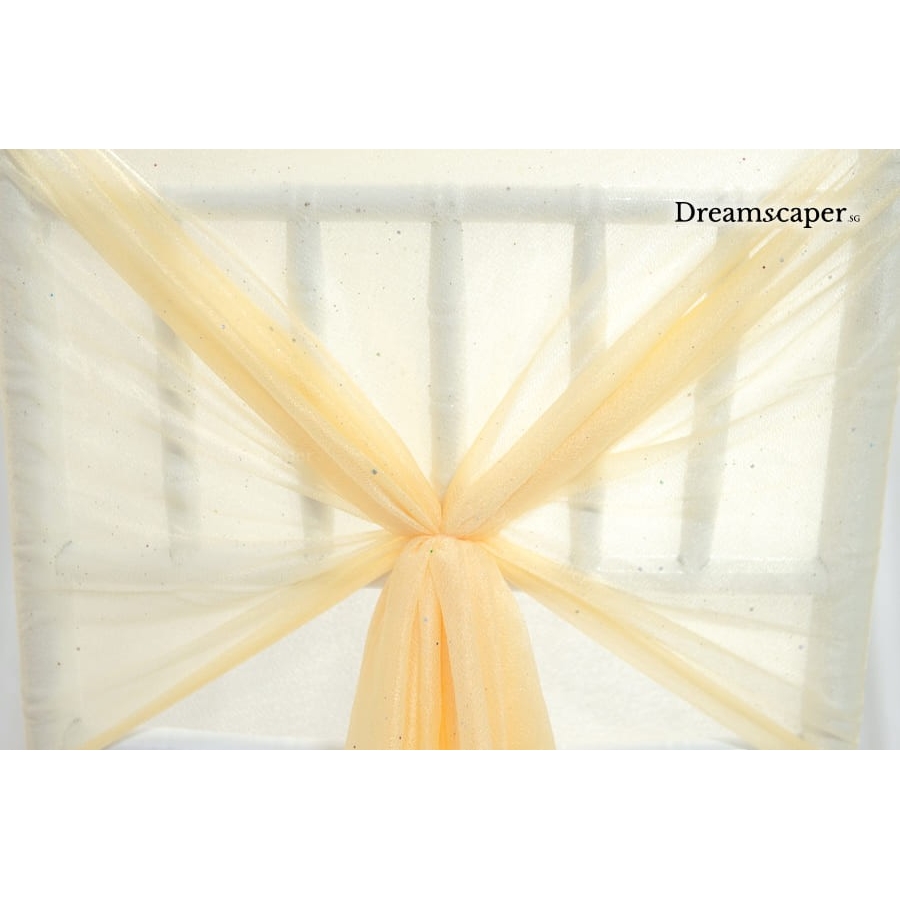 Sheer chair sash adds a romantic touch to your ROM solemnisation and weddings. This cover-style chair sash takes only seconds to set up and is best suited for tiffany chairs and napolean chairs. You can also adjust the knotted sash to the sides for an elegant aisle chair decor. There are some slight glitter on the cloth, which looks really nice in real life!