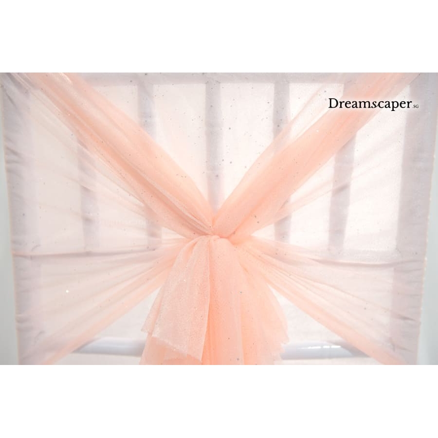 Sheer chair sash adds a romantic touch to your ROM solemnisation and weddings. This cover-style chair sash takes only seconds to set up and is best suited for tiffany chairs and napolean chairs. You can also adjust the knotted sash to the sides for an elegant aisle chair decor. There are some slight glitter on the cloth, which looks really nice in real life!